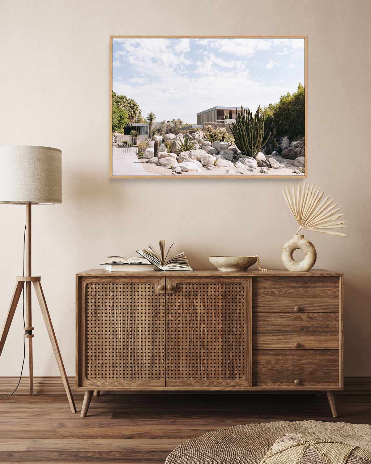 Ready to bring a little bit of Palm Springs to your home? The 'Kaufman Haus Palm Springs II' from Olive et Oriel is the perfect way to get that warm, desert paradise look - without ever having to leave the comfort of your own couch. This stunning framed canvas print is exclusive to Olive et Oriel and showcases a modern house framed by a rocky cactus garden, large boulders and palm trees. Perfect for adding an air of travel and sophistication into your space, it will add that touch of elegant luxury you’re after!